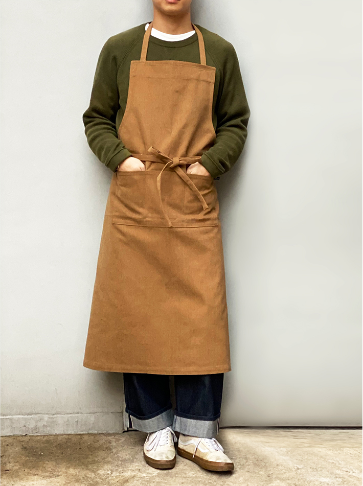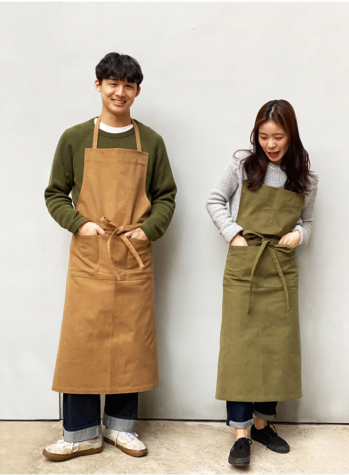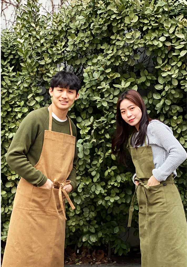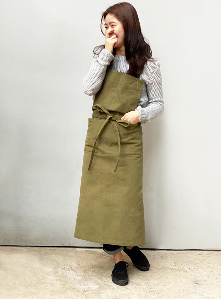 연출이 가능한 인버튼 롱 앞치마입니다.